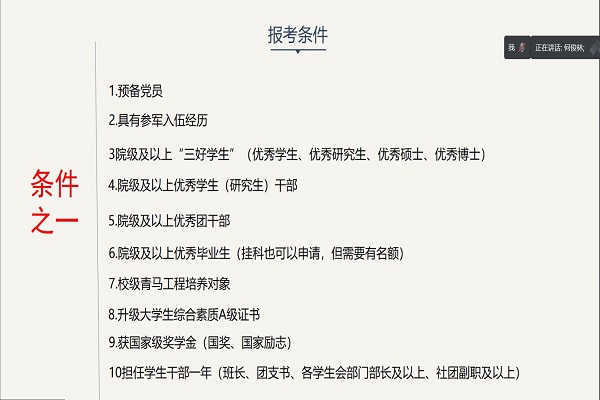 为给有意报考选调生的同学答疑解惑,11月18日晚19:30,由地科院主办的“本科生基层就业-备战选调生”经验分享会顺利开展,分享人为地科院2016级地理信息科学专业优秀毕业生何俊林,采用腾讯会议的方式,给同学们在线分享了他成功考取选调生的复习经验及心得感悟。