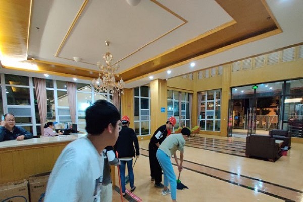 实习期间的实习地点多为泥泞,每次同学们回到基地后,大厅和楼道等地方的清洁工作压力巨大,为感谢基地工作人员尽心尽力的去为同学们的实习活动做后勤保障,学生有计划的开展基地公益劳动服务。