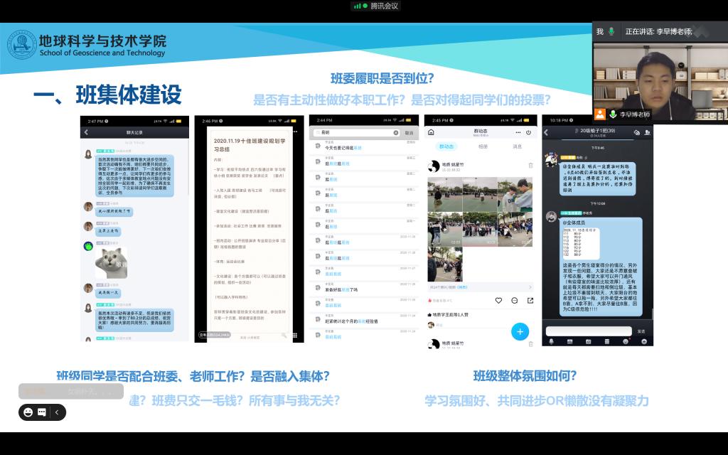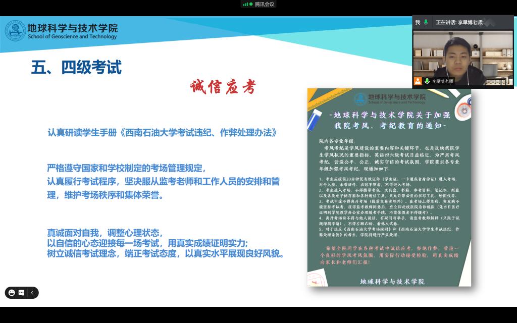 12月6日晚,2020级资源勘查工程、地质学专业全体同学在明辨楼各自习室参加了线上期中年级大会,大会由辅导员李早博老师主讲。此次年级大会李老师对两专业同学的学习生活等情况做了总结,并对本学期最后一个多月提出要求,鼓励同学们利用本学期最后的时间认真学习,不断进取。
