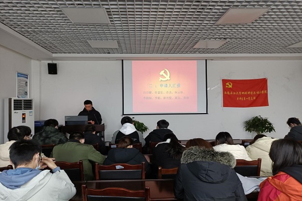 12月12日下午,地科院本科生第一党支部于明辨楼D404召开党员转正大会。支部会议由安金彪同志主持,支部全体党员同志参与,其中有表决权的正式党员16名,预备党员28名,符合大会要求。