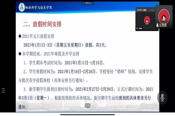 王晨晨老师还为同学们说明了考试时间安排、元旦节和寒假放假时间安排,并嘱咐同学们在假期要做好个人防护,出门戴好口罩,确保人身财产安全;避免春节期间暴饮暴食,保证身体健康,出行注意交通安全,注意防火防灾。随后王晨晨老师为大家讲解假期离校流程,做好寒假返乡信息登记,提前预定往返车票,坚持“错峰”离校原则,认真、按时填报健康系统。