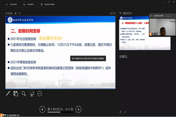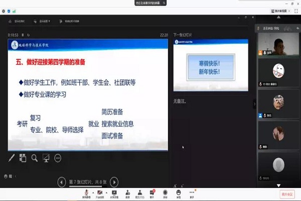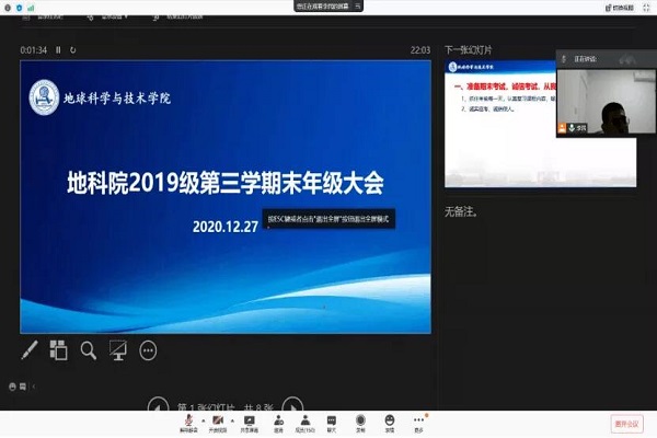 12月28日,地科院2019级于线上开展了第三学期末年级大会。本次大会由辅导员李民老师和陈然老师主持,地科院2019级全体同学参加会议。