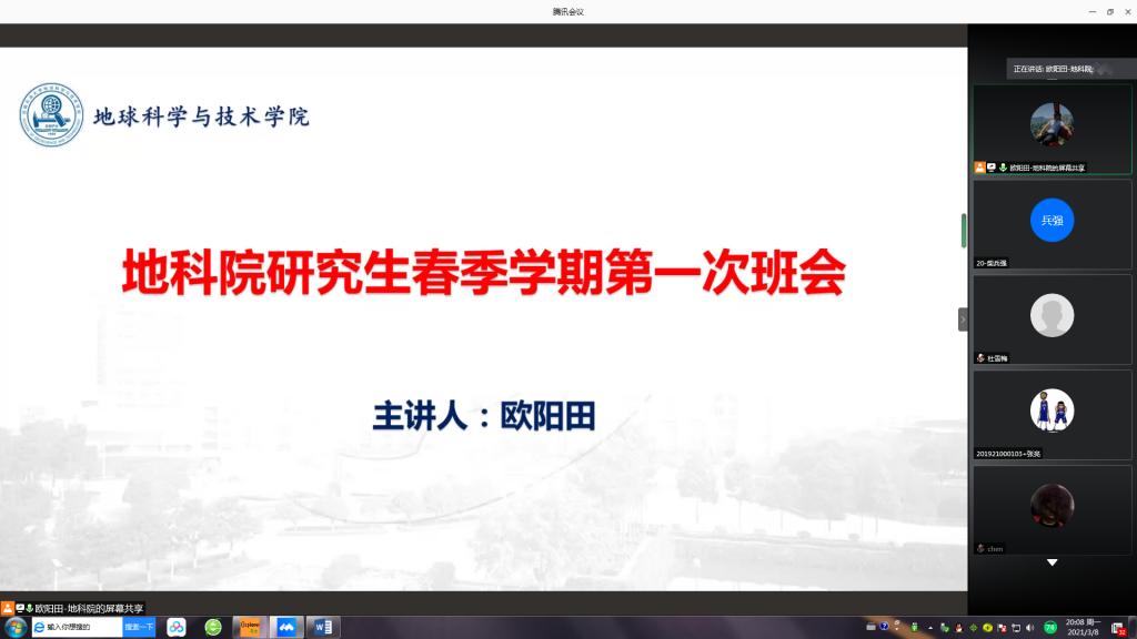 3月8日晚20:00,地科院研究生春季学期第一次班会以线上会议的形式顺利开展。此次班会由硕博研究生辅导员欧阳田主持,全体硕博研究生参与。