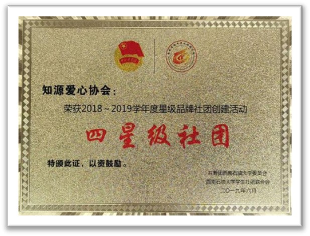 知源爱心协会连续荣获第五届"飞翔奖"最佳团队提名奖、全国最具影响力公益社团、全国高校百强学生社团称号;在2018-2019年度荣获西南石油大学年度四星级社团表彰;“衣暖凉山”活动获得中华慈善基金总会的荣誉证书。