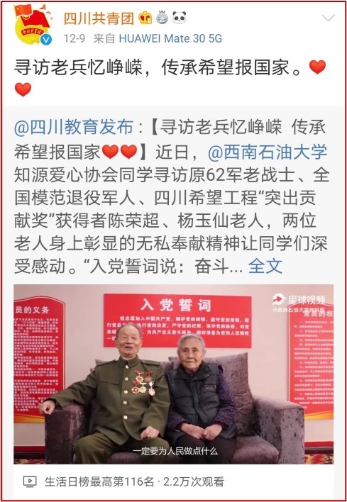 为继承并弘扬红色基因,知源爱心与原62军老战士、全国模范退伍军人、四川希望工程“突出贡献奖”获得者陈荣超、杨玉仙老人进行对话,立志将一代人的精神传承下去。