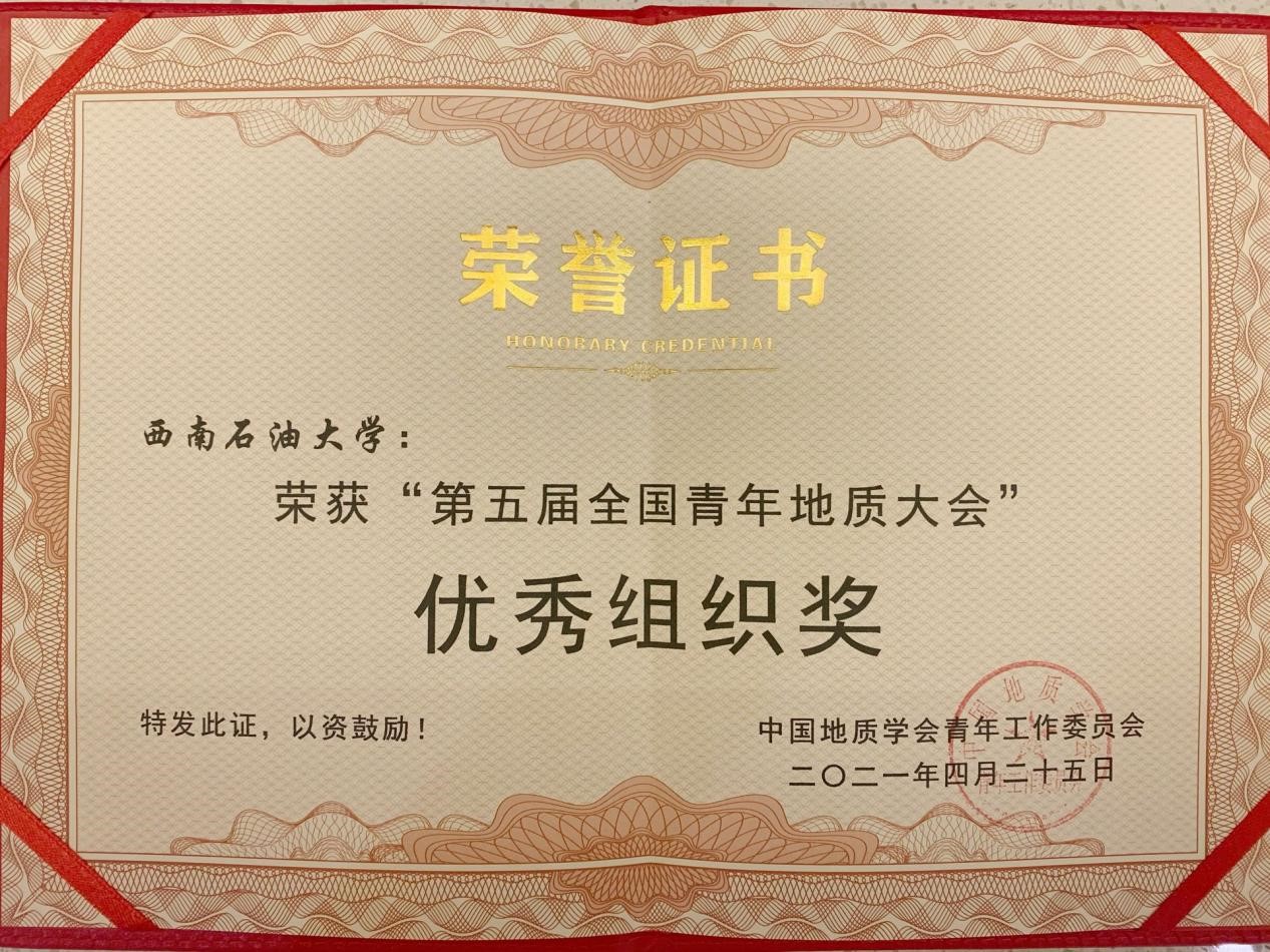 会后颁奖环节,我校荣获第五届全国青年地质大会“优秀组织奖”,硕士2020级王淮民同学所做的《盐津-筠连地区龙马溪组构造演化分析》获得第五届全国青年地质大会“优秀报告奖”。(图文/李雨桐)