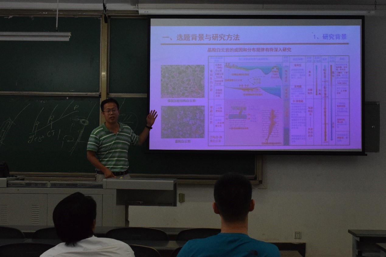 会议伊始,郭睿忻师兄带来了《断裂系统下碳酸盐岩储层发育机理—以塔里木盆地古城区上寒武统—中下奥陶统碳酸盐岩储层为例》的报告。郭师兄从介绍断裂相与断裂结构的特征与定义入手,展开描述了他的研究。他的研究认为富含酸性矿物的岩浆热液或者由岩浆参与的热液沿断裂体系侵入围岩交代而形成热液白云岩储层。除此之外,郭师兄重点阐述了关于热液白云岩储层的五个值得探讨的问题,并通过结合成岩后期成岩改造流体性质、断裂结构特征以及演化特征分析了塔里木盆地断裂体系下碳酸盐岩储层成因机制及分布规律研究。在乔占峰师兄《埋藏白云岩成因及储层发育规律》的报告中,乔师兄从选题背景与研究方法、埋藏白云岩成因机制和规模优质储层发育特征三个方面介绍了他的研究。乔师兄提到,晶粒白云岩的成因和分布规律一直是地质学家的研究热点。在他的研究中,他以塔里木盆地阿克苏地区永安坝剖面为研究重点,在详细的露头剖面实测和沉积岩石学分析的基础上,开展了包括铸体薄片、阴极发光、微量稀土元素面扫、有序度等岩石学分析等先进地球化学分析手段。在整个博士论坛讲座过程中,到场的同学积极与博士师兄们进行交流,提出自己的疑问,气氛持续高涨。