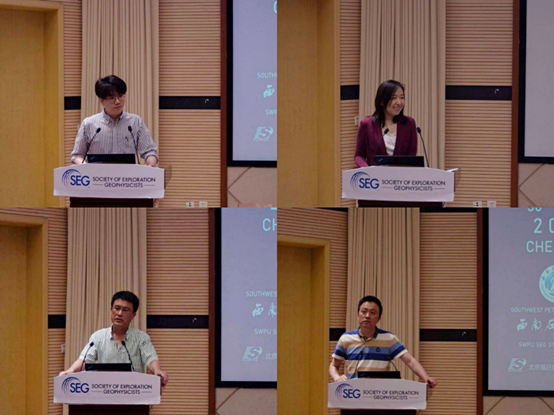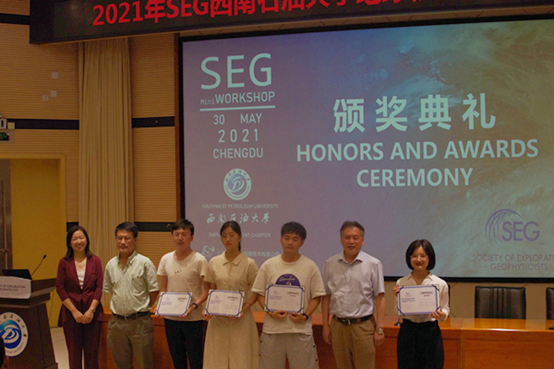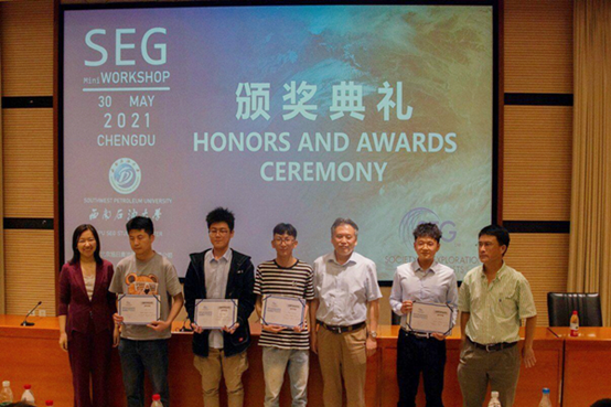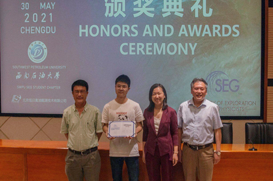 经过评委打分,最终选出一个最佳口头报告奖,四个杰出口头报告奖以及四个杰出展板奖,并由SEG中国总经理吴敬宇、SEG中国执行理事黄旭日及SEG学生分会指导老师尹成教授为获奖同学进行颁奖。邓琳平同学的《Research on prediction method of fluvial sand body Boundary》精彩报告夺得最佳口头报告奖,张然松、罗歆、邱泽华、卢汉威四位同学的精彩报告获得杰出口头报告奖,王琳、黎孟承、师执峰、刘婧诗四位同学的展报获得杰出展板奖。