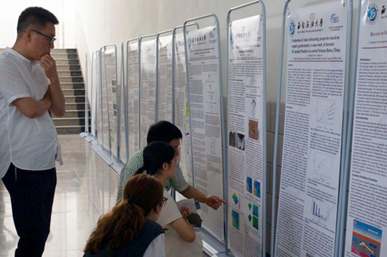 在会场报告进行的同时,由黄旭日、徐云贵、刘福烈三位老师组成的展板评委团对会场海报进行现场评分,并对学生的报告内容作了详细的指导与建议。