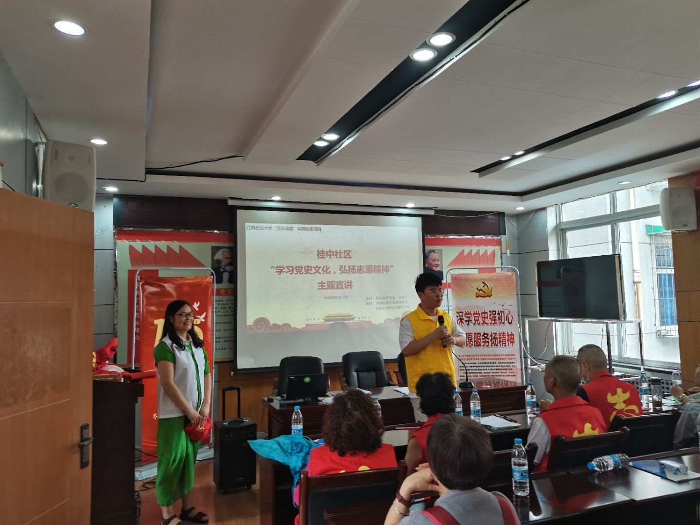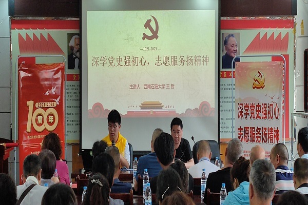 为积极响应国家对青年学子走进社区、建设社区的号召,深入学习中国共产党的百年辉煌历史,传承我党的光荣传统和优良作风,在志愿服务的过程中践行劳动教育精神,6月3日,地科院青年志愿者协会的志愿者们赴桂中社区开展党史宣讲活动,社区党员和学生志愿者共同学习党史,开展志愿服务活动。本次活动由地科院青年志愿者协会与桂中社区居委会、新都区小草公益服务中心联合举办。