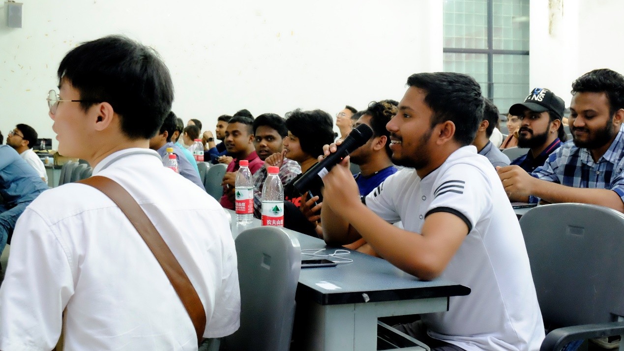 紧接着活动进入有奖竞答环节,问题内容包含汉服起源、含义和类别等,到场留学生争先恐后地举手参与答题,现场气氛持续高涨。