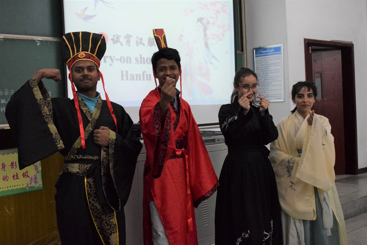 “天青色等烟雨,而我在等你”,在一首《青花瓷》歌曲表演过后,部分留学生在活动现场试穿汉服,更加直接、深刻地感受汉服的魅力。