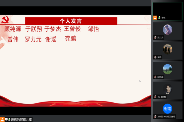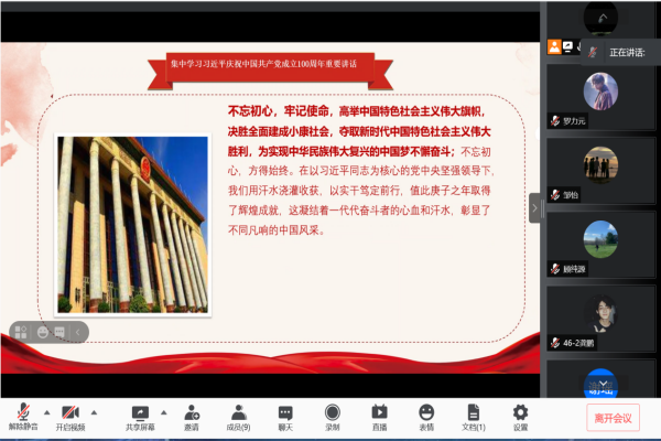 为了响应党中央“学党史、明党理”的要求,地科院党委要求本科生第一党支部几位预备党员进行相关党史教育专题组织活动在2021.8.29.21:00地科院本科生第一党支部党史学习教育专题组织活动在组长曾伟的组织下,于腾讯会议进行了此次活动。