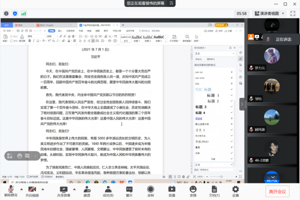 曾组长提出此次会议主要有六个方面,进入会议第一项,播放共青团团歌,几位预备党员激情地唱完了团歌。进入会议第二项“集中学习习近平庆祝中国共产党成立100周年重要讲话”,曾组长向各个预备党员再一次强调了习近平总书记在中国共产党成立一百周年的重要讲话的内容。曾组长说到,请党放心,强国有我,正是我们当代青年应该做到的。会议第三项开展谈心谈话,各个预备党员都说到在假期都比较玩物丧志,对于当时的学习并没有重视。各个预备党员都说到了各自比较突出的问题。随后各个党员开展批评和自我批评。各个党员都提到个人对党史的学习和理解并不到位,思想感悟不够深刻。对于这种问题,曾组长说到:“对于党史的学习,突出的问题在于我们应该多组织这类的活动,集中学习党史,感悟和交流每个人的不同看法,要有思想的碰撞。才会使得每个人看待问题的角度越来越全面”会议最后一项,进行整改落实,各个预备党员都提到了自己的解决方法,如罗力元同志提到,对于学习党史,应该理解党的初衷,要深入挖掘党的每一项措施意义,不懂就问等等。曾组长也提到,深入学习党史,需要交流,以史为鉴,避免错误、以史为鉴,开创未来。