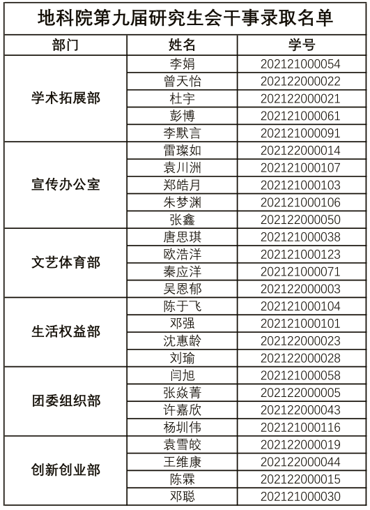 为进一步开展研究生教育管理工作,于2021年9月22日晚上9:50开展了地科院第九届研究生会招新工作。根据校研会改革管理办法,结合地科院研究生会具体情况,本着“公平、公正、公开”的原则,由个人自荐、经过面试,拟录取以下26位同学为地科院第九届研究生会干事,公示期从即日起至2021年9月25日。如对录取名单存有异议,请向研究生主席团和欧阳田老师反映。希望在各位同学的监督下,新干事们可以团结上进,与研会一起为学院的建设添砖加瓦!