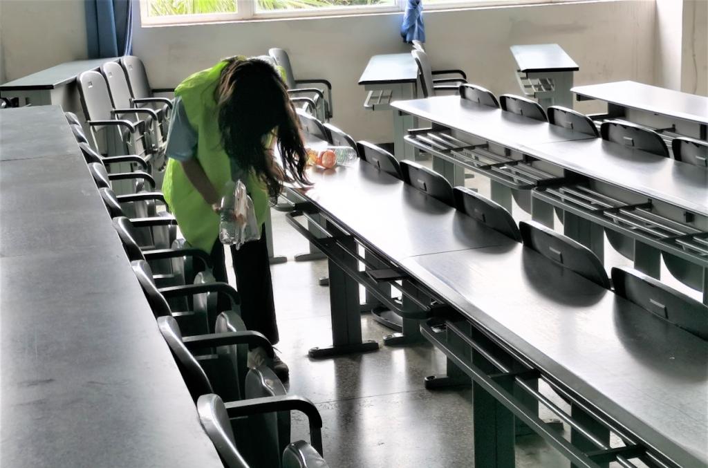 本次打扫的重点主要是明辨楼c区一楼至四楼的楼梯和教室卫生以及a区大厅卫生。首先,在工作人员的指导下,志愿者们先在明辨楼C区集合,并分配工具。在准备工作做好以后,同学们有序地进入教学楼进行打扫,同学们用扫帚清扫楼梯的灰尘以及教室里的垃圾,以及用拖把清洁地面,在同学们的共同清扫下,整个教学楼变得焕然一新。