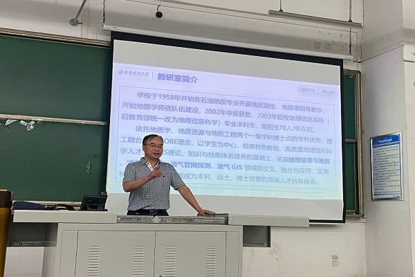 首先王泽根老师向我们介绍了地理信息科学专业的教研室概况。地理信息科学于2003年开始招收本科生,致力于培养地理信息系统与油气GIS的交叉融合应用型人才,并且形成了本科、硕士、博士完整的人才培养体系。