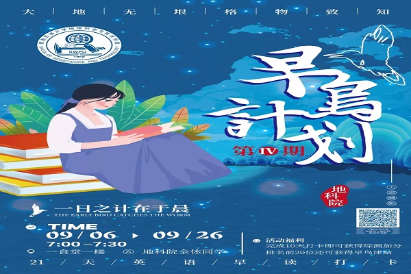 加入“地科院英语学习群”(群号759983012),在群内发送“我要报名第四期早鸟计划+姓名+学号+专业年级”再@管理员“英语角李瑞琦”同学即可参与报名,报名时间截至9月15日。