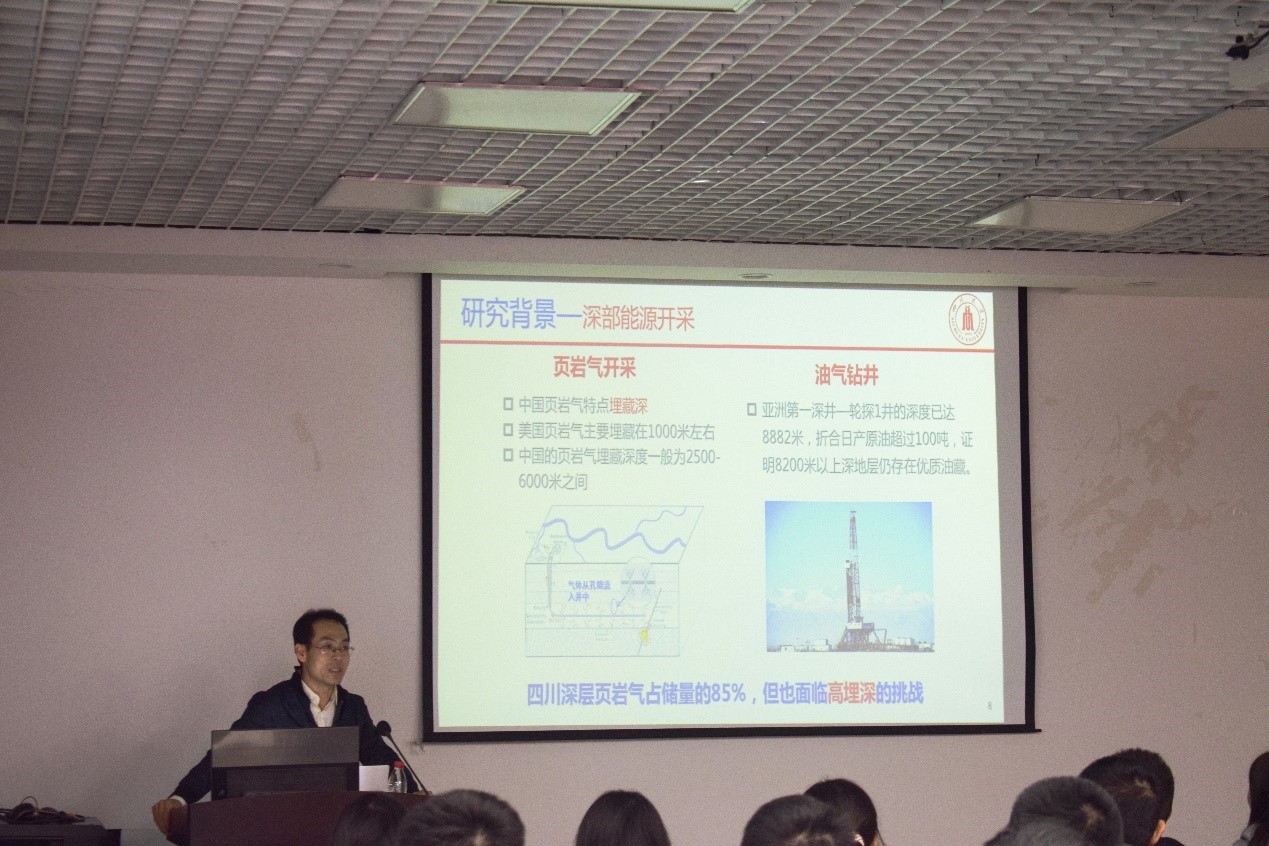 报告中,刘建锋教授依次介绍了在钻井工程、能源储库工程、水电工程、高放工程和页岩气工程中,由于高埋深所带来的问题和研究方案。他指出,目前深埋钻井工程存在的问题主要有以下三个方面:不同岩性导致的井壁收缩坍塌、钻井井壁应力释放以及井壁由于钻井液冲刷及盐岩溶解而产生的矿物质流失。其后,刘教授介绍了在针对不同温度、工程应力条件、岩性以及受力状态,以及不同类岩石的蠕变速率及蠕变特性下所做的细致研究对比。最后他总结提出,深部复杂条件下的岩石蠕变特性需要做更多的基础理论研究,且针对不同的工程条件,需要合适的理论模型和数值仿真的有效融合。报告结束后,数位同学提出自己的疑惑,刘建锋教授耐心解答并与同学们分享自己的心得体会。