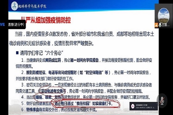 会议伊始,王晨晨老师就当前成都疫情的严峻形势呼吁同学们要积极做好防疫措施,接着详细为同学们解读了学校疫情防控相关通知,嘱咐同学们必须做到通知中讲到的“六个务必”、“六个不得”及“六个坚持”。王晨晨老师重点强调各位同学务必要按时进行健康打卡、有情况不隐瞒及时上报、离校要按照规定履行相关手续等重要事项。随后,王晨晨老师就预防电信诈骗方面为同学们分析了我校发生的典型诈骗事件,提醒同学们提高警惕防范电信诈骗,积极下载“国家反诈中心APP”,谨防诈骗。