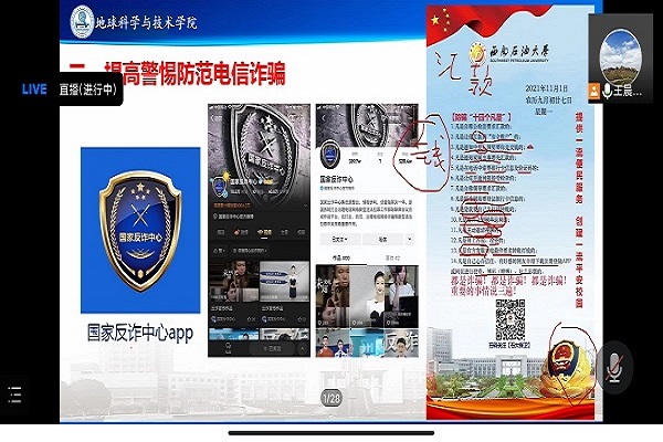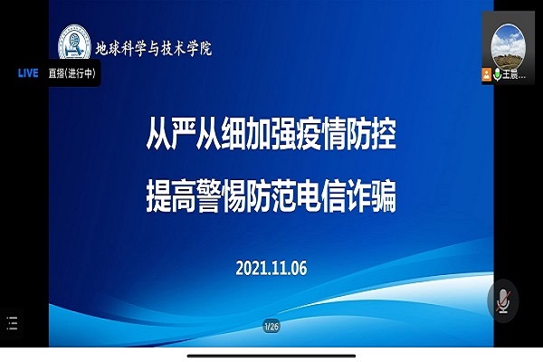 为严格落实学校和社区防疫要求,做好疫情防控工作,11月5日上午10:30,地科院2018级勘查、地空、地信专业在线上召开以“加强疫情防控,杜绝电信诈骗”为主题的年级大会,勘查、地空、地信全体同学在腾讯会议参加线上会议,本次大会由地科院辅导员王晨晨主持召开。