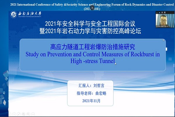 11月7日,我院岩土与地下工程教研室研究生刘哲言与张哲两位同学顺利参加2021年安全科学与安全工程国际会议暨2021年岩石动力学与灾害防控高峰论坛(SSSE),为积极响应国家防疫政策,会议全程在线上进行。