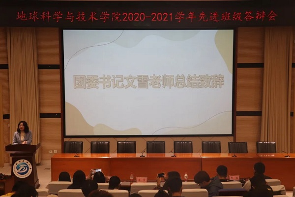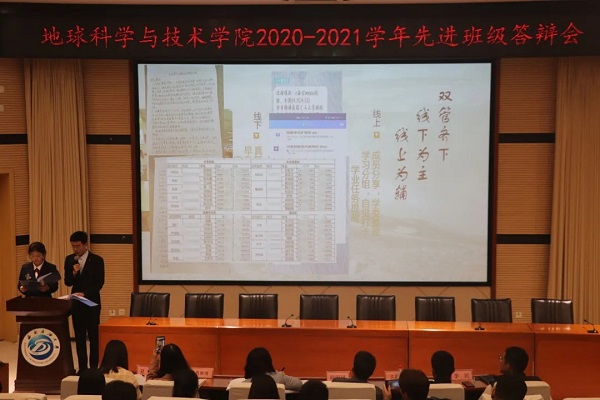 10月26日晚19:00,地科院2020-2021学年先进班级答辩在思学楼A114顺利举行。地科院团委书记文雪,团委副书记欧阳田,各年级辅导员,学生会主席团以及部分19、20级学生观众参加了此次活动。
