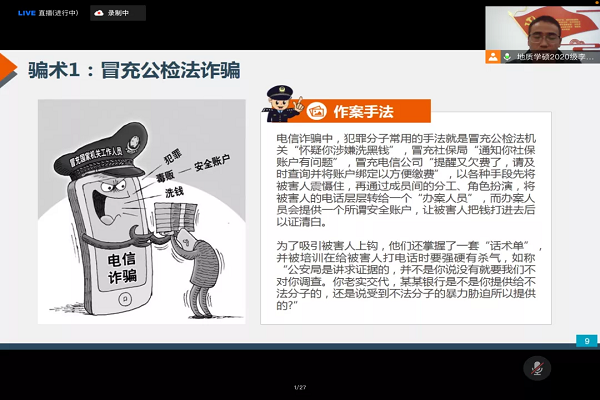 为坚决预防和遏制涉校、涉生电信网络诈骗犯罪的高频发生,切实维护校园安全稳定。11月17日,地科院联合保卫处召开《地科院防范电信网络诈骗专题讲座》线上会议。会议通过讲解典型电诈案例、反诈知识,将反诈宣传迅速覆盖到每一位同学。