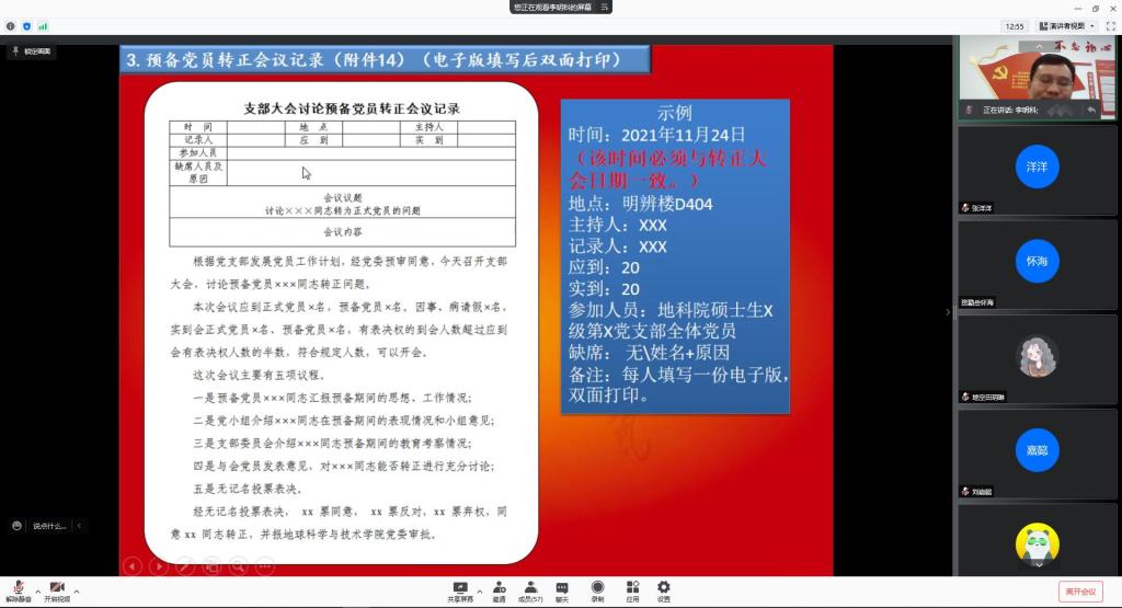 为了加强党风建设以及发展学生党员工作的规范化,培养出新一批优秀党员,地球科学与技术学院于11月30日晚上7点在腾讯会议上举行了党员知识培训讲座,本次讲座由地科院李明科老师主讲,地科院各党支部书记、副书记以及转正党员参与培训。