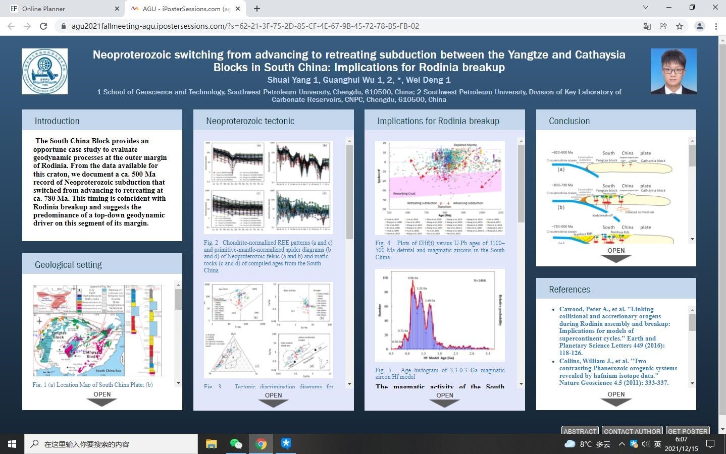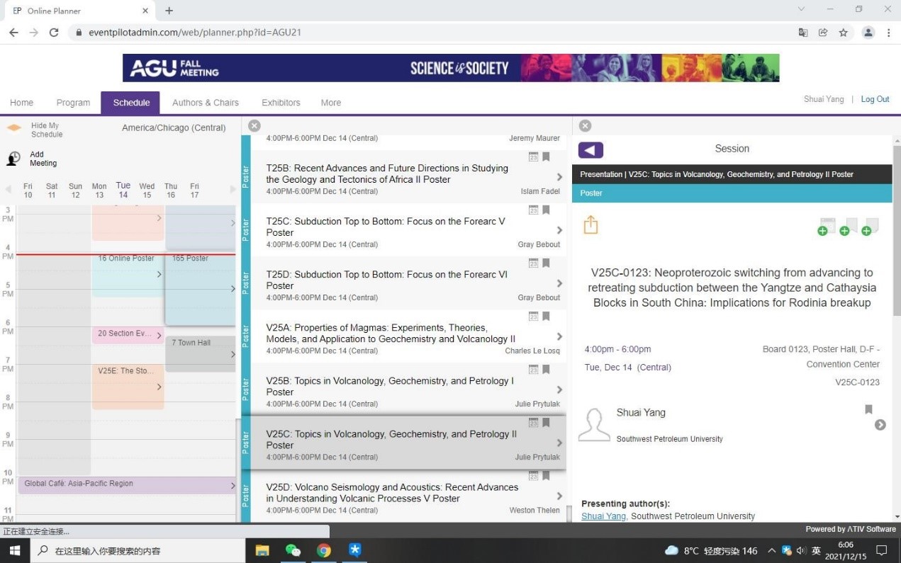 美国地球物理学会秋季会议(AGU Fall Meeting)是全球最大的地球科学和空间科学领域的大型国际学术会议,来自全球各地的地球科学和空间科学领域的知名专家学者在本次会议中分享了他们的最新研究成果。我院博士研究生杨率在火山学、地球化学和岩石学专题(Topics in Volcanology, Geochemistry, and Petrology)中张贴了以《Neoproterozoic switching from advancing to retreating subduction between the Yangtze and Cathaysia Blocks in South China: Implications for Rodinia breakup》为题的学术论文,讨论了华南新元古代扬子陆块和华夏陆块之间从前展到后撤的俯冲转换对罗迪尼亚超大陆裂解的指示意义。我院博士研究生赵亚汶在原位岩石年代学和热年代学的进展及应用专题(Advances and Applications of in Situ Petrochronology and Thermochronology)中张贴了以《A subduction-related rifting in the Ediacaran Tarim Craton: Insights from the geochronological and geochemical evidences》为题的学术论文,讨论了埃迪卡拉纪塔里木克拉通内与俯冲有关的裂谷作用。