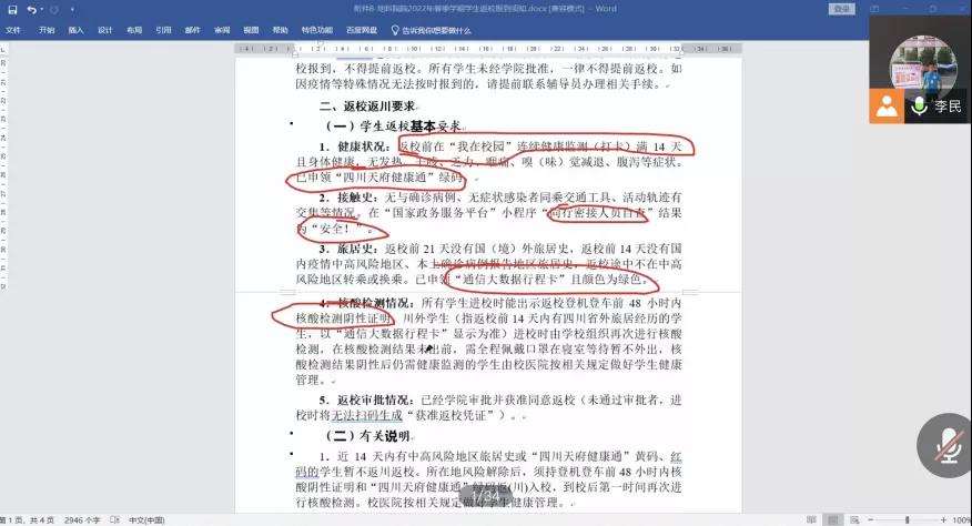 李民老师详细阐述了开学的相关要求,包括不同批次同学开学返校时间、返校所需提交的材料、详细的返校流程以及其他相关信息。李民老师强调,疫情期间返校要注重个人防护和安全,认真完成健康打卡,积极配合学校在疫情期间的相关工作。返校后,同学们仍应时刻保持警惕,非必要不外出,勤洗手、戴口罩,做好个人防护,必要外出请假一定要规范办理请假手续,积极配合学校和学院的疫情防控工作。