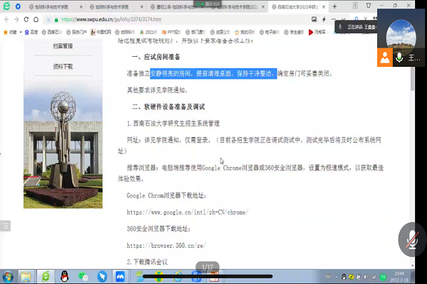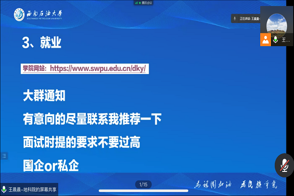 3月18日,地科院2018级考研复试、调剂与就业指导说明会在腾讯会议顺利召开。此次会议的召开旨在帮助同学们了解考研复试与调剂的流程,摸清就业形势。地科院2018级全体同学出席本次会议,本次指导会由地科院辅导员王晨晨主持召开。
