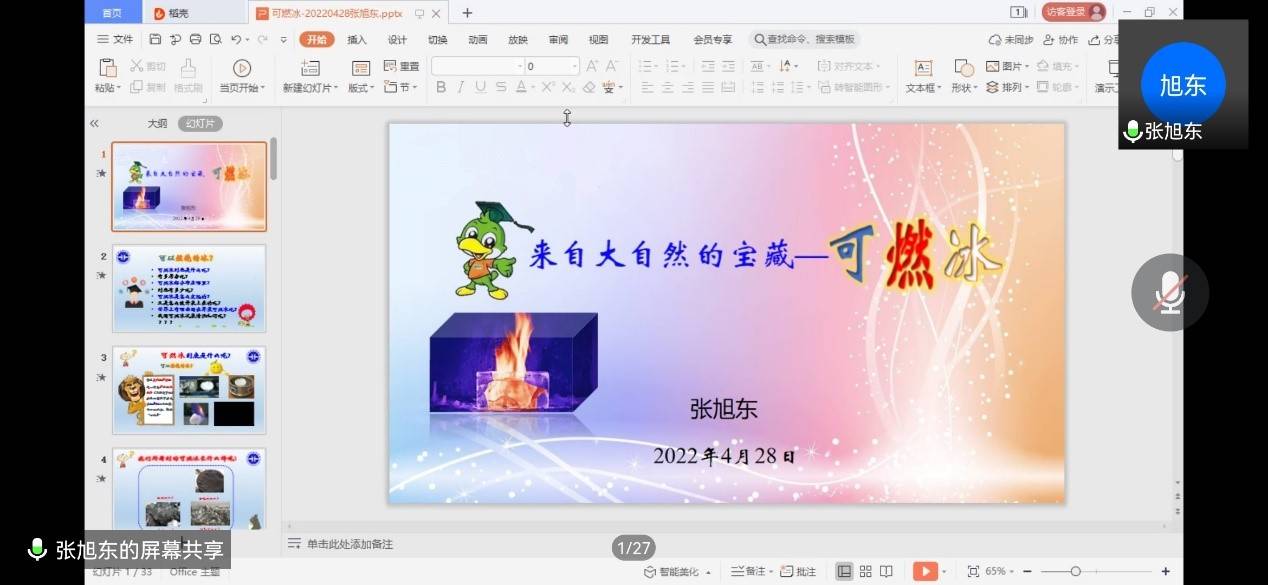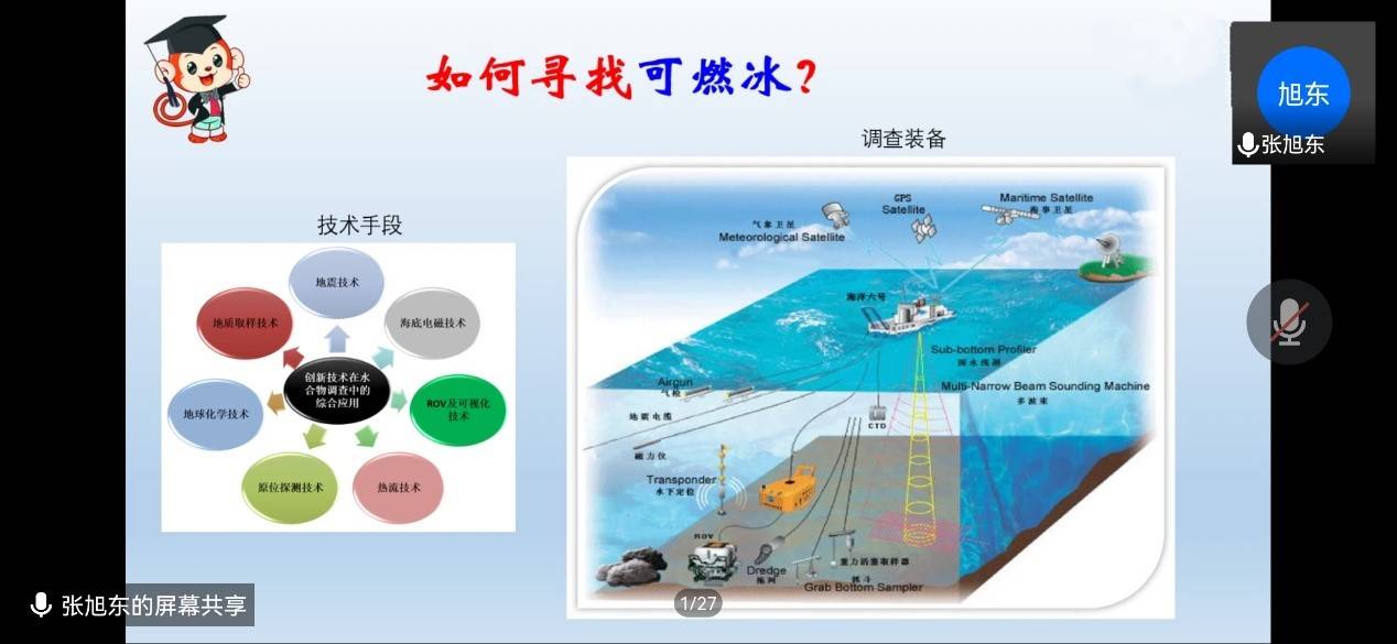 4月28日下午,我院张旭东博士于腾讯会议线上开展题为《来自大自然的宝藏-可燃冰》的学术讲座。张旭东博士结合自身天然气水合物成像与反演科研经历,着重介绍我国天然气水合物勘探开发现状及未来发展趋势,也为同学们揭开了可燃冰的神秘面纱。