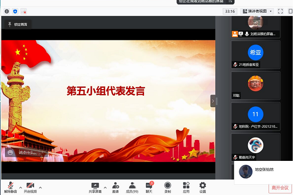 首先,经过各小组提前的组内讨论,选出了小组代表,并在会议上对小组讨论内容做了总结发言。其中,来自2021级地质学专业的陈坤同学说到:“我们要坚持从‘小我’做起,自觉遵守学校相关防疫规定,再引导周围的人做好疫情防控,要发挥新媒体优势,积极传播正能量,进一步稳定情绪、增强信心,在实践中发扬爱国主义精神。青年是整个社会力量中最积极、最有生气的,在疫情防控中,我们应该要有责任和担当。我们作为入党积极分子,不仅要担负一定的社会责任,更要注重磨练自己,要从理论到实践全面升华自己,把自己投入到爱国敬业的实践中。”