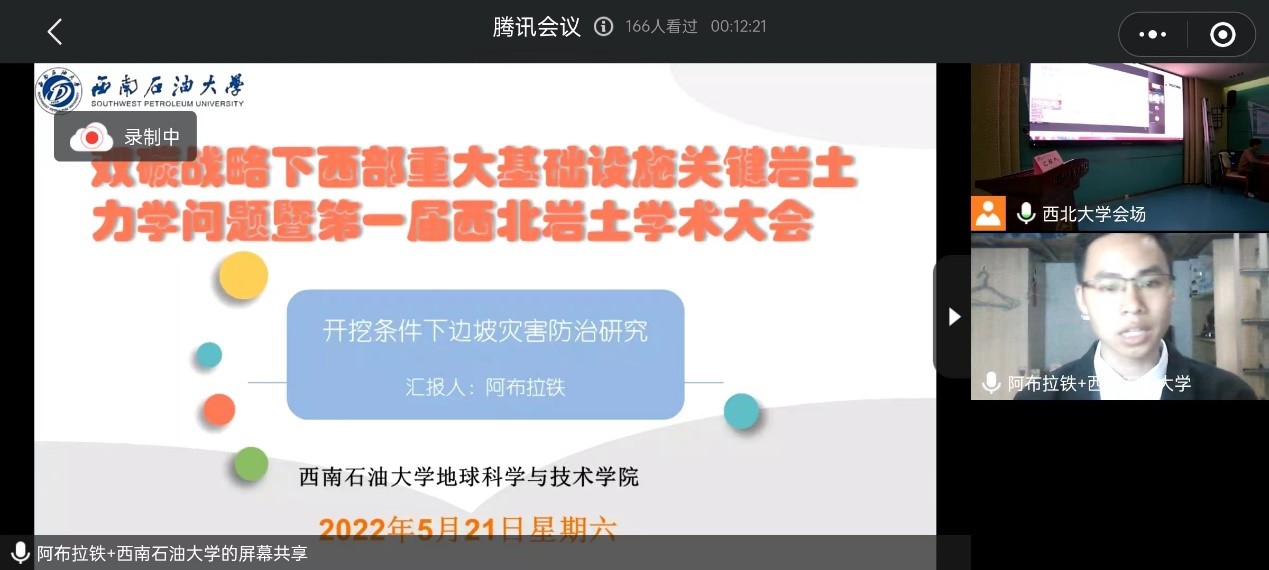大会聚焦西部地区的交通工程、水利水电工程、西部地质灾害防治等关键岩土力学问题和工程实践问题,旨在分享最新前沿理论和研究成果。本次会议邀请了相关行业的多名专家,做报告。钱七虎院士做了题为“双碳目标下的城市建设”的主题汇报,王双明院士、赵阳升院士分别做了题为“双碳目标与主体能源变化”、“双碳背景下的几个岩体力学问题”的特邀报告,此外还有来自国内各个高校和相关研究院的多名学者分别做了会议专题报告。我院硕士研究生阿布拉铁做了题为“开挖条件下边坡灾害防治研究”的专题报告,并与参会专家进行了深入探讨和交流。