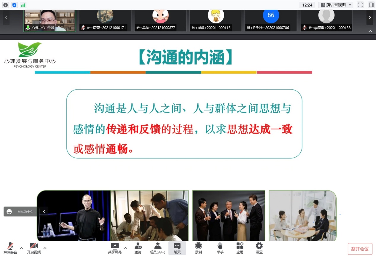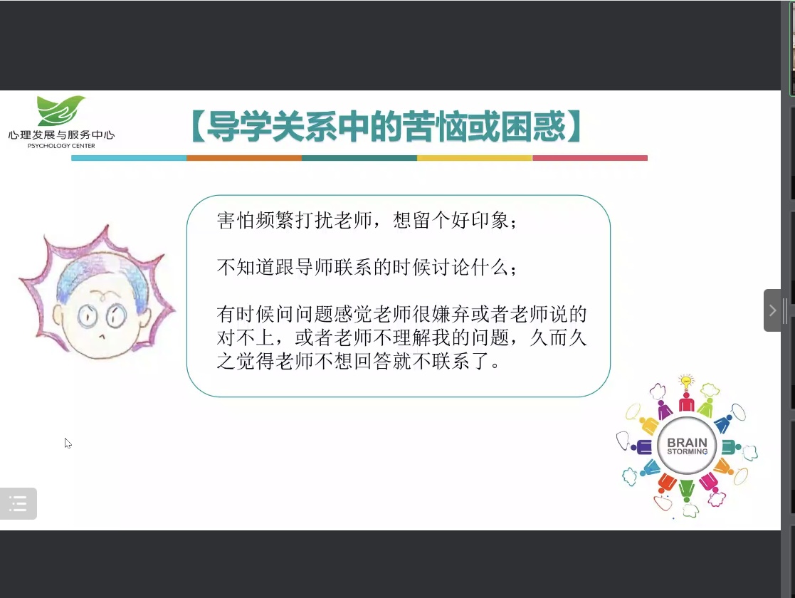 本次讲座历时一个半小时,讲座以“沟通与改变,和谐导学关系的构建”为主题,向大家展示了在处理导学关系中常见的问题与部分同学的困惑;并且从沟通的类型、内涵、问题等方面来向各位同学仔细分析了导学存在的问题以及如何建立良好的沟通关系,同学在本次讲座踊跃提问,老师也耐心地解答。会议氛围良好,效果收获俱佳。向同学们呈现了和谐导学关系的构建,分析了说话的艺术,又向同学们介绍了光环效应等影响人际知觉的因素。