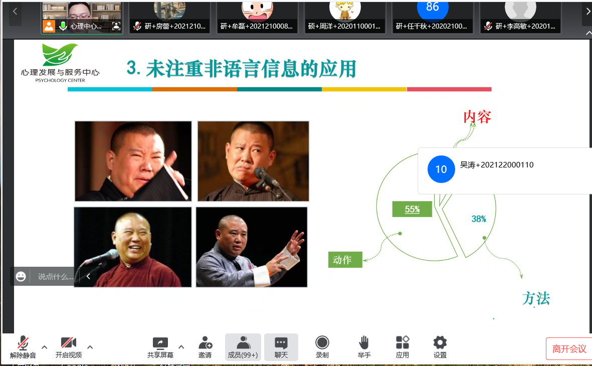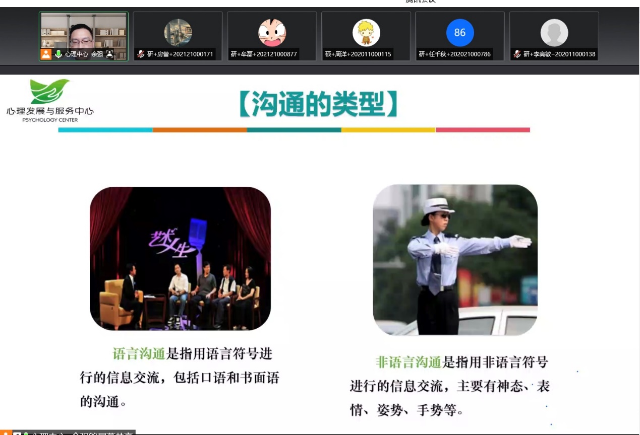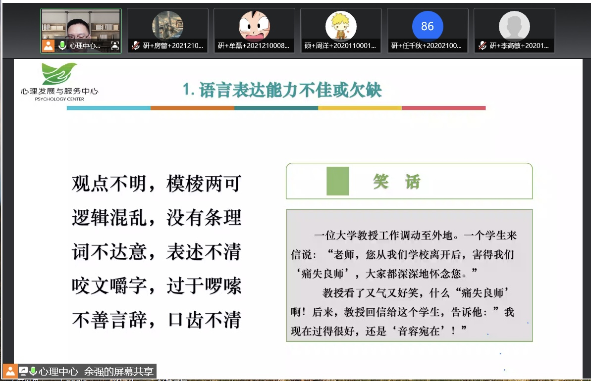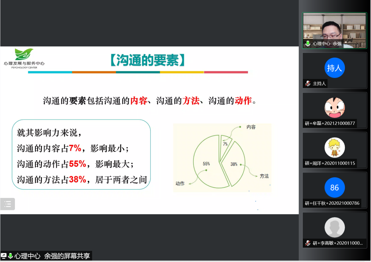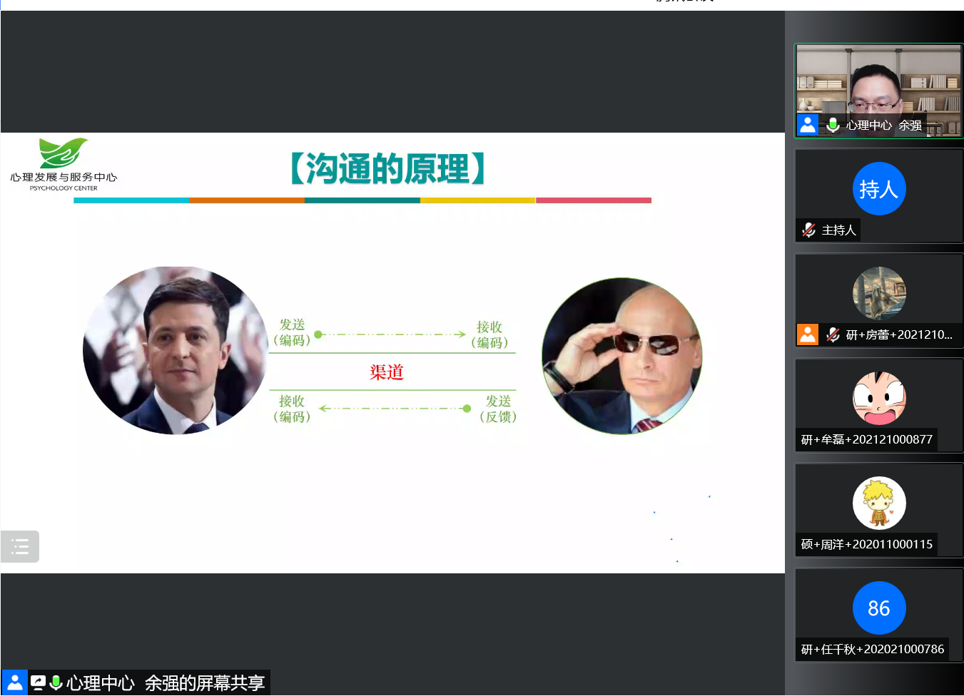 6月9日下午15:00,由心理发展与服务中心主办、地科院心理服务站承办的阳光“心”成长系列讲座第三讲在线上顺利召开。本次讲座由国家二级心理咨询师、心理发展与服务中心专职教师余强老师主讲,共约500名本科生及研究生参加此次讲座。