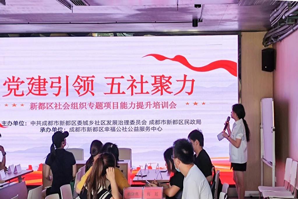 2022年6月28日,为了助力新都区社会组织发展,为社区发展治理培育一批优秀且专业的社会组织,推动基层治理的发展,新都区幸福公社公益服务中心为此组织筹办了“党建引领 五社聚力 ”社会组织专题项目能力提升培训会。本次培训会在成都绿色金融中心开展,区委社治理科科长雷腾等参与了本次培训。