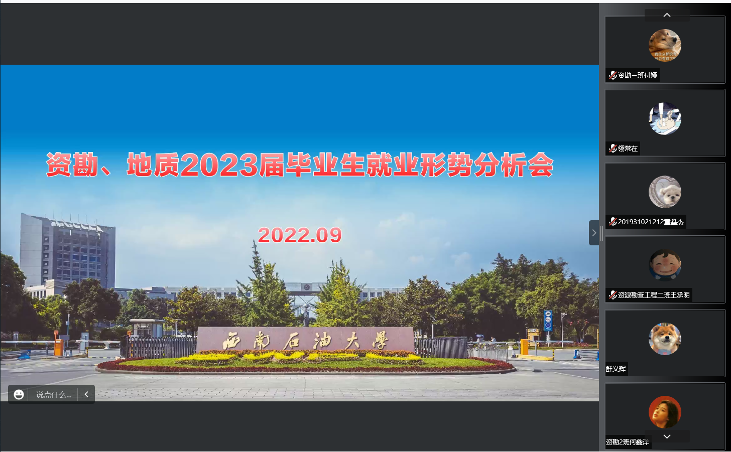 由于疫情的影响,同学们不能按时到校进行线下学习,但这并不能阻挡大家对即将毕业生活的憧憬。伴随着新学期的来临,2019级资勘、地质专业的同学们已经步入了大四。为帮助2023届毕业生进一步提高同学们对考研与就业的认知,了解当前毕业生即将面临的考研与就业的新形势,帮助刚刚步入大四生活的同学们做一个有关考研和就业的全面规划,认清当前就业形势,抓住机遇。9月4日晚21点,地科院资勘、地质2023届毕业生就业形势分析会于腾讯会议召开,2019级资勘、地质专业全体同学参加本次大会,本次会议由资勘地质辅导员李民老师主持召开。