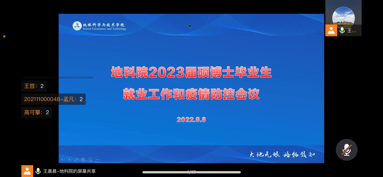 为引导毕业生树立正确求职观念、及早确立求职目标,提升就业能力,了解当前学校及学院相关就业政策,推动毕业生顺利就业,同时做好疫情防护工作,9月8日上午10点,地科院通在线上召开2023届硕、博士毕业生就业工作和疫情防控会议,全体2023届硕、博士毕业生参加本次会议,本次大会由地科院辅导员王晨晨主持召开。