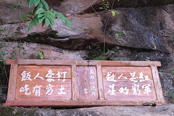 也只有如实践队成员一样真正见识到先辈们驻地环境的艰难,才能切身体悟到革命红军的坚韧不拔和矢志不移。精巧的“藏兵崖”是令人叹为观止,藏下了旷继勋将军的四千兵马,但是崖下拥挤的空间也令部队苦不堪言。而昔日的红军步道的一部分虽然已经长满杂草,但是从路面宽度依然可以依稀看见那时的步道也不过半米宽,两边都是沟渠,步道耸立其中,稍有不慎便会人仰马翻,但是那时的先辈们面对数倍于自己的敌军的包围,进出翻山只能走这样的崎岖小道。在学习到红军步道时实践队员们感慨:“想象着那时的通讯员们,手持急信,需快马加鞭,但是路面又很难走,肯定是困难重重,先辈们真是太坚韧了,我们一定要学习这种精神。”