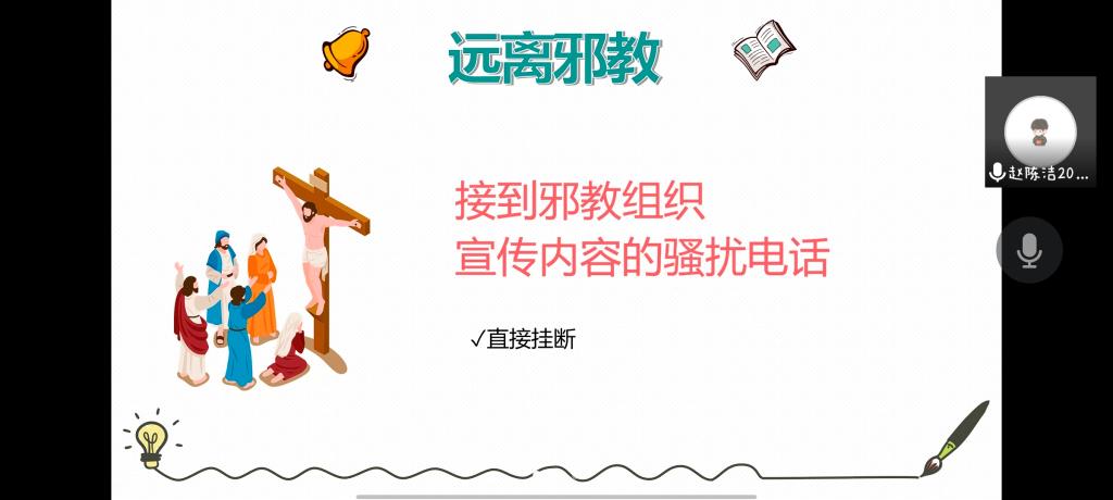 为进一步提高广大人民群众识邪、防邪、拒邪和反邪能力。2022年8月20日,夕阳红吉吉王国实践队面向新都区方营社区开展了远离邪教线上讲座。帮助居民充分认清邪教危害,号召居民积极参与到反邪教的斗争中,建设平安社区,构建和谐家园。