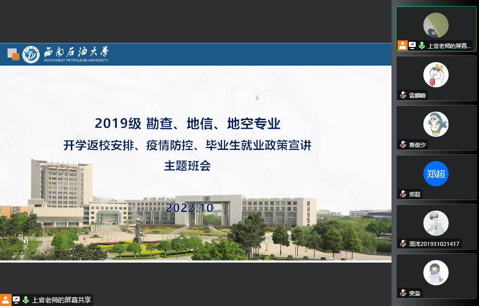 10月1日,地科院2019级勘查、地信、地空专业在线上顺利开展开学返校安排、疫情防控、毕业生就业政策宣讲主题班会。本次会议由辅导员上官晴天主持,2019级勘查、地信、地空专业全体同学参加本次会议。