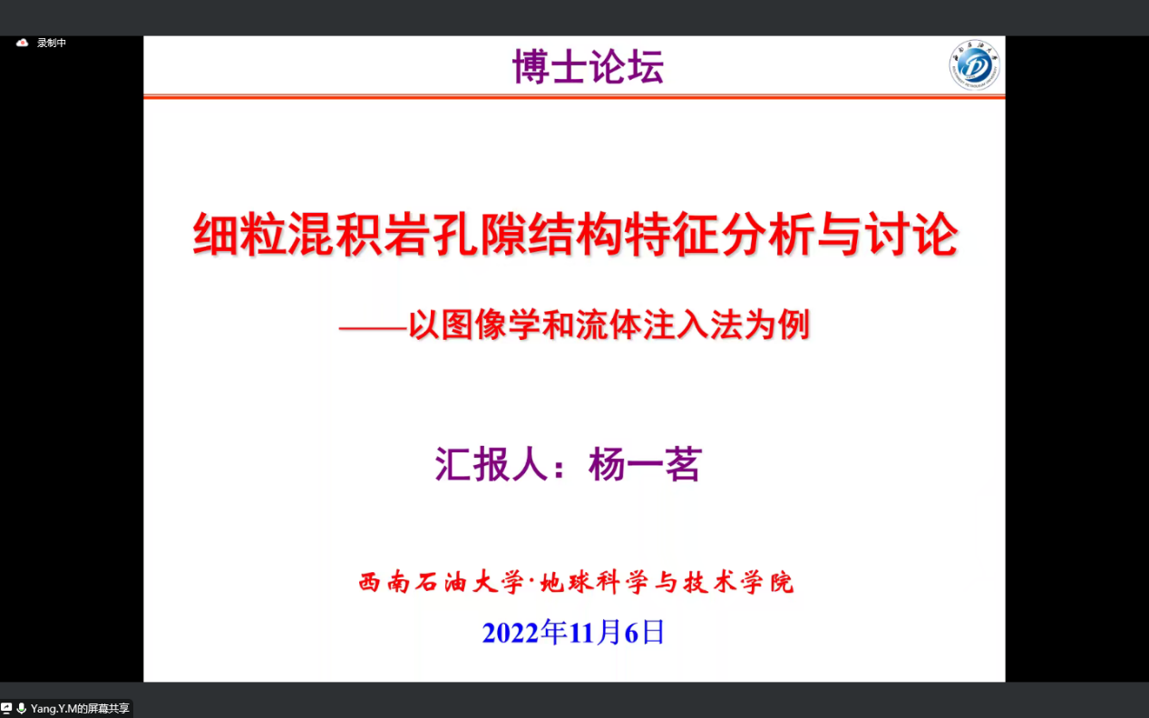 为进一步营造良好的学术文化氛围,11月6日下午,在我院举办的博士论坛中,杨一茗博士和廖建波博士于腾讯会议线上分别开展了以细粒混积岩孔隙结构特征分析与讨论、陆相湖盆深水沉积搬运机制研究为主题的学术讲座,地科院部分师生参会。