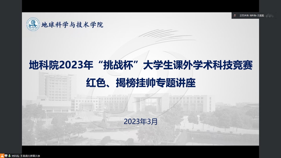 2023年3月2号,地科院辅导员王晨晨老师以线上形式主持召开2023“挑战杯”大学生课外学术科技竞赛红色、揭榜挂帅专题讲座。