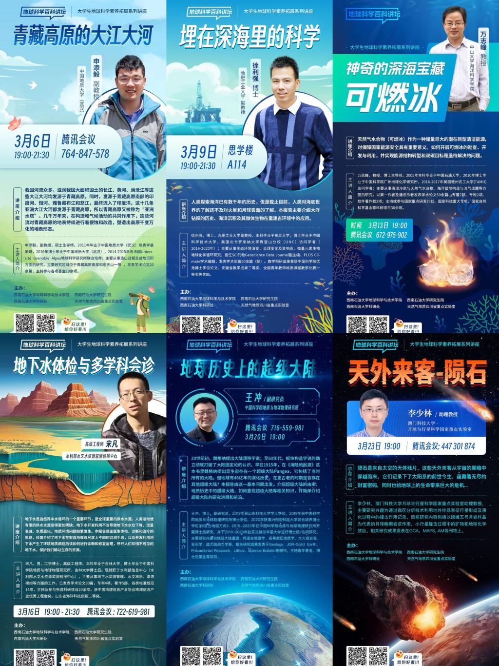 为提高大学生地球科学素养,拓展大学生学术眼界,地科院于近期组织了一系列地学讲座,邀请各大高校学术领域顶尖教授与行业内经验丰富的工程师进行地球科学科普讲座。讲座的内容由山川到深海,从地质演变到新型能源,介绍范围兼收并蓄,得到了同学们的一致好评。