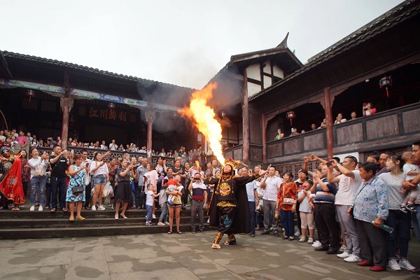 游客们在观看喷火表演