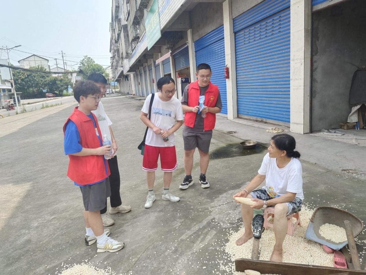 “这么热的天,你们在这里干嘛?”阿姨一边拨着手中的玉米,一边问我们。“阿姨,我们是大学生来这里宣传普及医保知识的,请问您买了医保吗?”实践队队员陈修德回答道。“买了的!”阿姨自豪地回答道。与阿姨的谈笑间,队员们似乎也忘记了炎热,此时留下的汗水是幸福的。