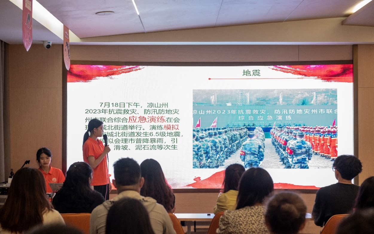 上午的宣讲活动与地质有关。通过前期调研,结合讲解员自身地学专业特色,萤光实践队选择对西昌易发的地质灾害进行科普。在为期一小时的宣讲中,实践队宣讲员张潇怡首先为大家介绍了地震、山洪、泥石流等地质灾害的防治措施。她利用照片、科普小视频等多种媒介,并通过实际案例为听众们介绍了这些地质灾害发生的原理、灾害预警、自救方法等。
