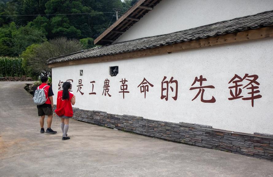 在当地村委会指导下参观红色文化墙